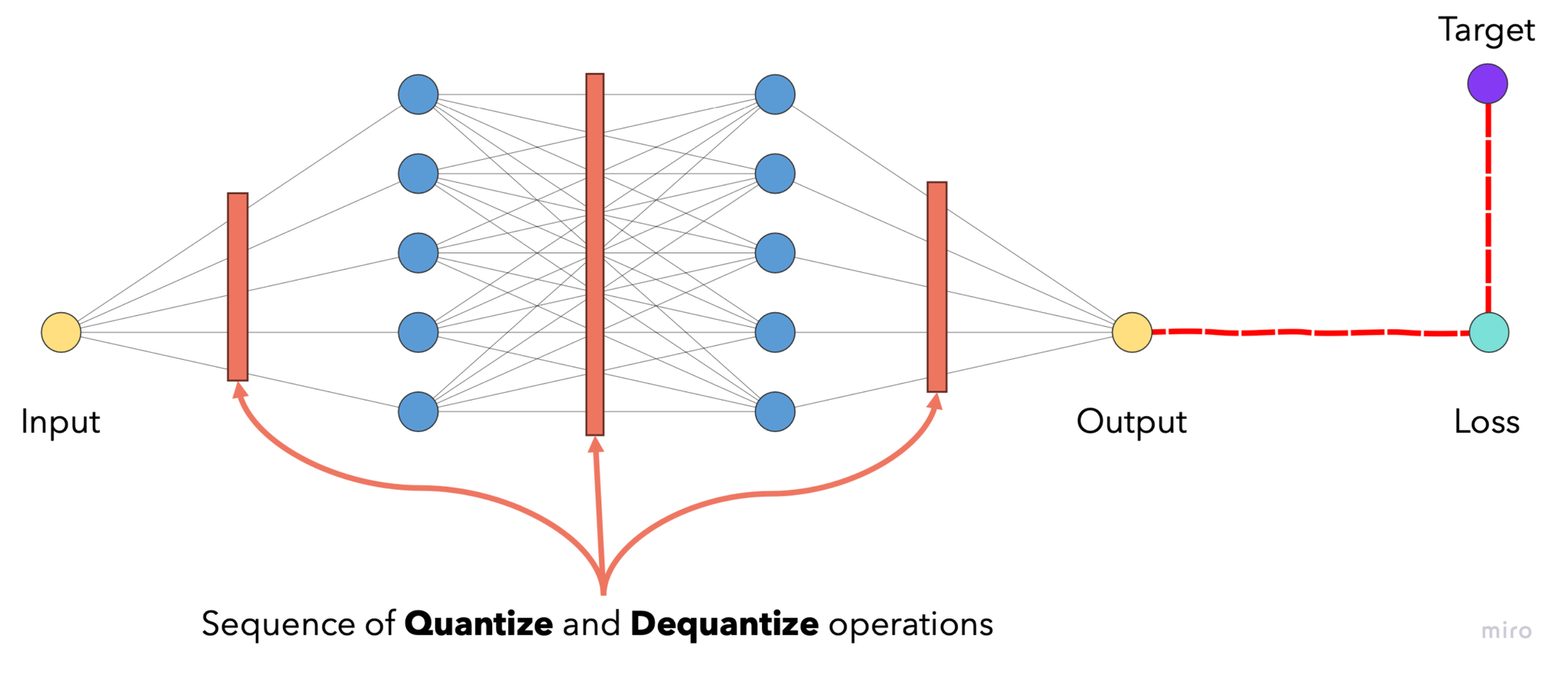 During the forward pass, tensors are quantized and immediately dequantized at these modules, thus taking quantization errors into account when optimizing the loss function. The model's parameters are therefore guided to a point on the loss function where it is robust against quantization errors.