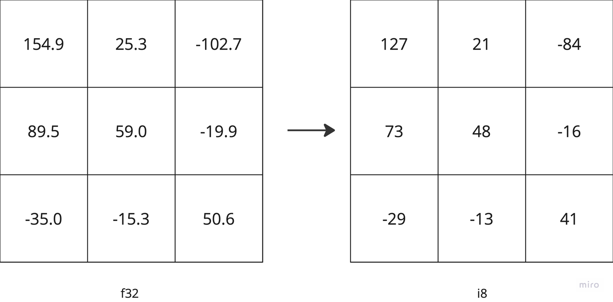 In the example above, we map the range of the largest absolute value to the full range of int8, via a scale parameter.